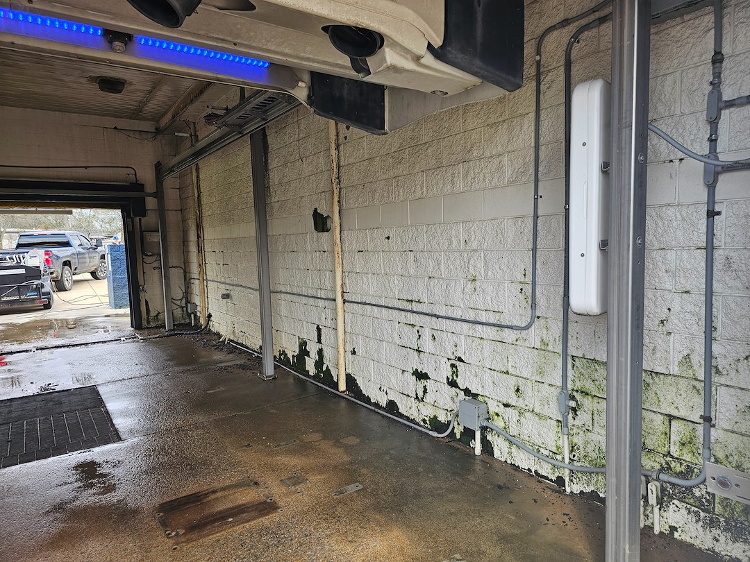 The interior white walls of the wash bays had developed significant algae and moss growth, which can make a facility look dirty and poorly maintained. Using professional soft washing and pressure washing techniques, we safely treated and rinsed the walls to remove organic growth and brighten the white surfaces, restoring a much cleaner appearance.